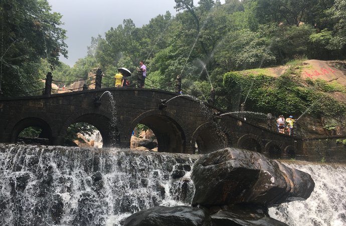 從市區(qū)的蘇欣客運站坐游3路去的,車子是空調(diào)公交有些老舊,出了市區(qū)穿行在郊區(qū)的道路上比較顛簸。因為不是節(jié)假日景區(qū)很清靜,門口有幾個攤位,大部分都沒有出攤。因為前一天下了中雨,看到了水流很大的瀑布、怪石、蟲子,景區(qū)基本就是沿著一條山溝的左側(cè)展開,逐步盤桓上升,曲折蜿蜒,山頂是一個小水庫,估計是為了保持平時的景區(qū)供水。穿過水壩上的過水道就來到右側(cè)的下山道路。下上就沒有太多景色,只能遠眺下山下田野。山不太大,不太累,山水都很迷你。景區(qū)維護的衛(wèi)生狀況不錯,山下小吃電價位也算合理。